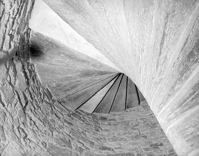 Le donjon, escalier, vue générale de dessous.Immatriculation