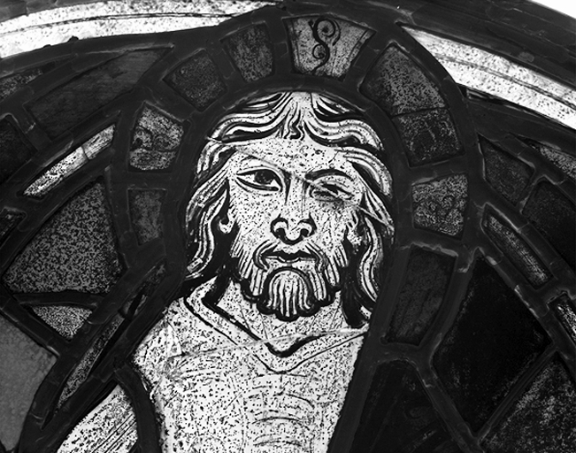 Tympan, rose, oculus central : détail de la tête du ChristImmatriculation