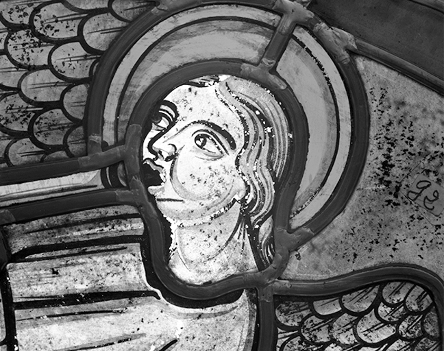 Tympan, trilobe supérieur gauche, lobe supérieur : détail de la tête de l'angeImmatriculation