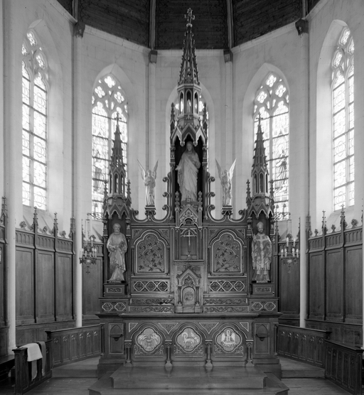Autels (3), retables (3), confessionnaux (2), chaire à prêcher, lambris de hauteur, stalles, statues (8), groupe sculpté (maître-autel, autel secondaire), style néo-gothique, église paroissiale Saint-Martin (Le Sel-de-Bretagne),