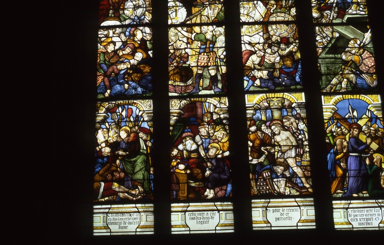 Verrière (maîtresse-vitre) : Passion, Résurrection, Jugement dernier, église Paroissiale Saint Hernin (Locarn),