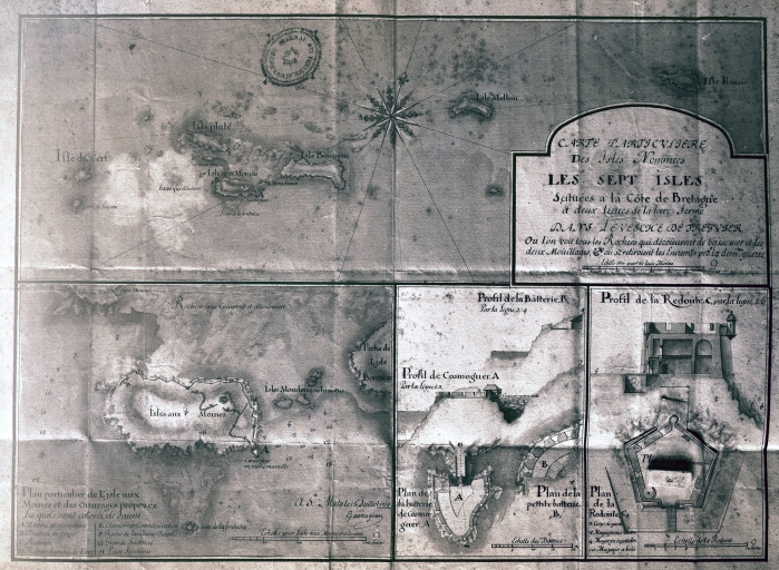 Carte des Sept Iles : détail de l'Ile-aux-Moines, plan et coupe de batterie et redoute.Immatriculation