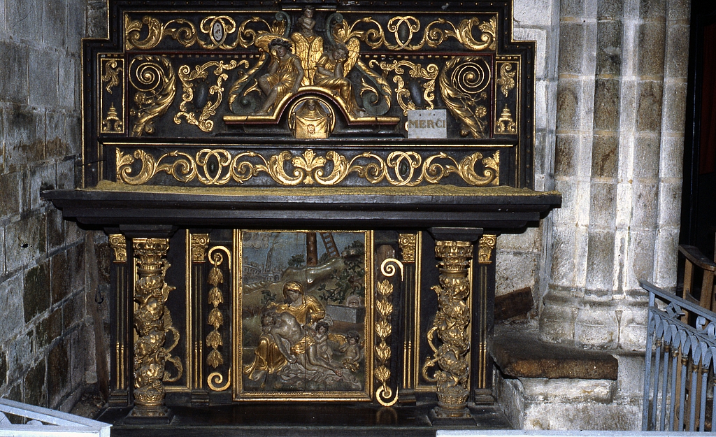 Autel, gradin d'autel, thabor (autel secondaire, autel table), de Notre-Dame de Pitié, (anciennement retable numéro 5), église paroissiale Notre-Dame-de-Roscudon (Pont-Croix),