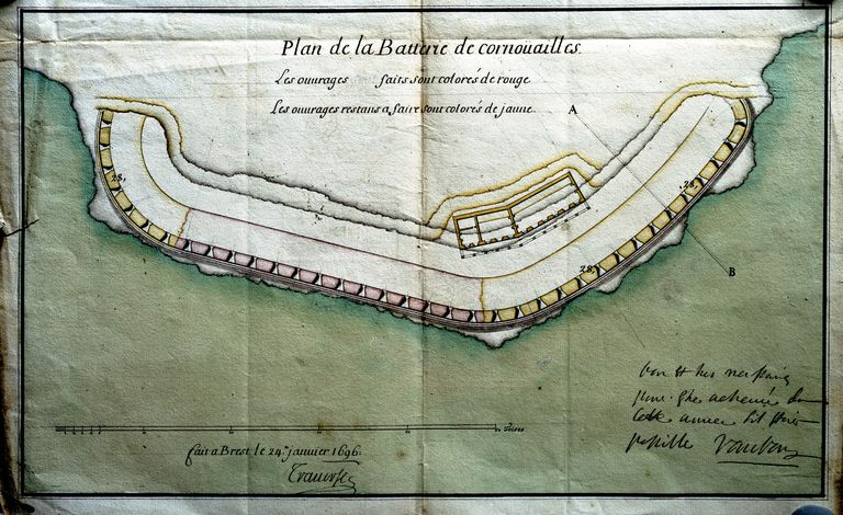 Plan de la batterie de Cornouaille, fait à Brest le 24 janvier 1696 par Traverse contresigné par VaubanImmatriculation