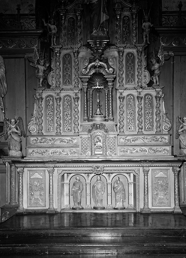 Autel, tabernacle, exposition, gradins d'autel (2) (maître-autel, autel tombeau, tabernacle architecturé), dit du Sacré-Coeur, (anciennement autel retable numéro 1), église paroissiale Saint-Vinoc (Plouhinec-29),