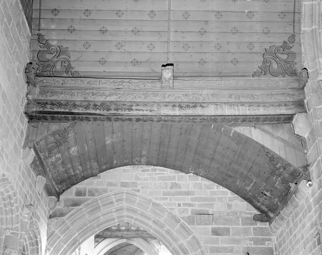 Ensemble de sablières et blochets sculptés, sablière n°1, bas-côté sud, mur est, partie gaucheImmatriculation