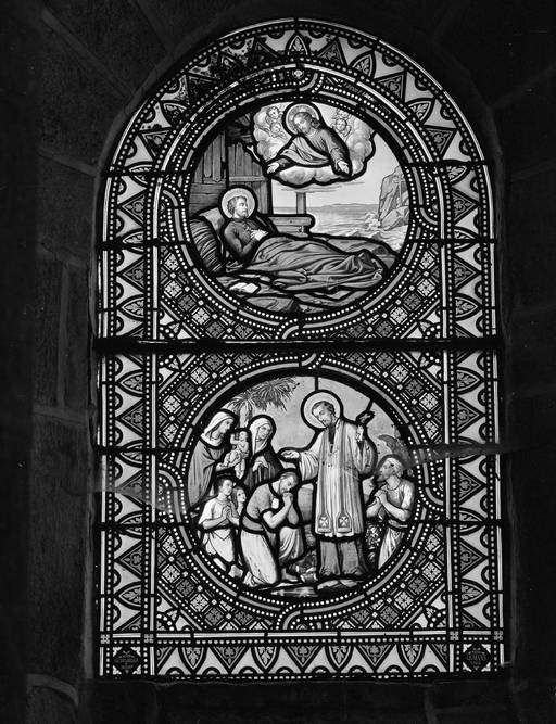 Verrières (8, verrière typologique, verrière légendaire) : vie de saint Augustin, vie de saint Alfred, vie de saint Hilarion de Chypre, vie de sainte Catherine, vie de saint Yves (baies 0, 2, 7, 91, 13, 17 et 19), église paroissiale Notre-Dame-de-Roscudon (Pont-Croix),