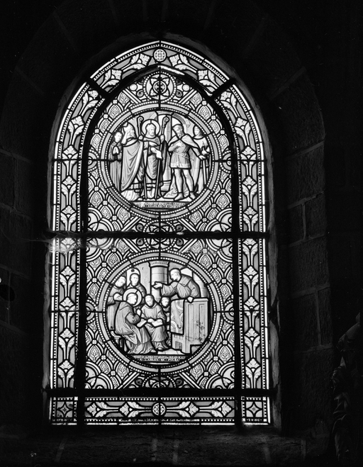 Verrières (8, verrière typologique, verrière légendaire) : vie de saint Augustin, vie de saint Alfred, vie de saint Hilarion de Chypre, vie de sainte Catherine, vie de saint Yves (baies 0, 2, 7, 91, 13, 17 et 19), église paroissiale Notre-Dame-de-Roscudon (Pont-Croix),