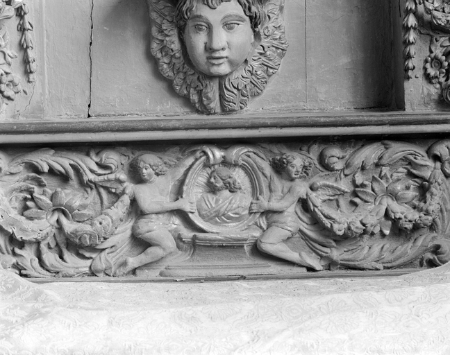 Détail du gradin, deux angelots portant le médaillon avec le ChristImmatriculation