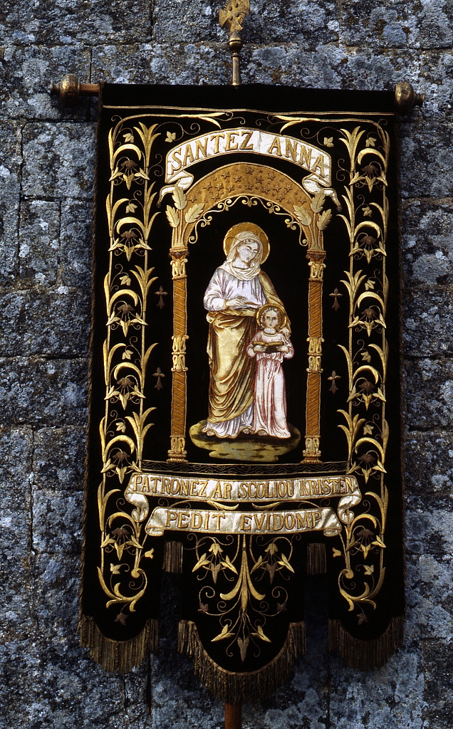 Bannière de procession (anciennement numéro 3) : Education de la Vierge, sainte Jeanne d'Arc, église paroissiale Saint-Magloire (Mahalon),