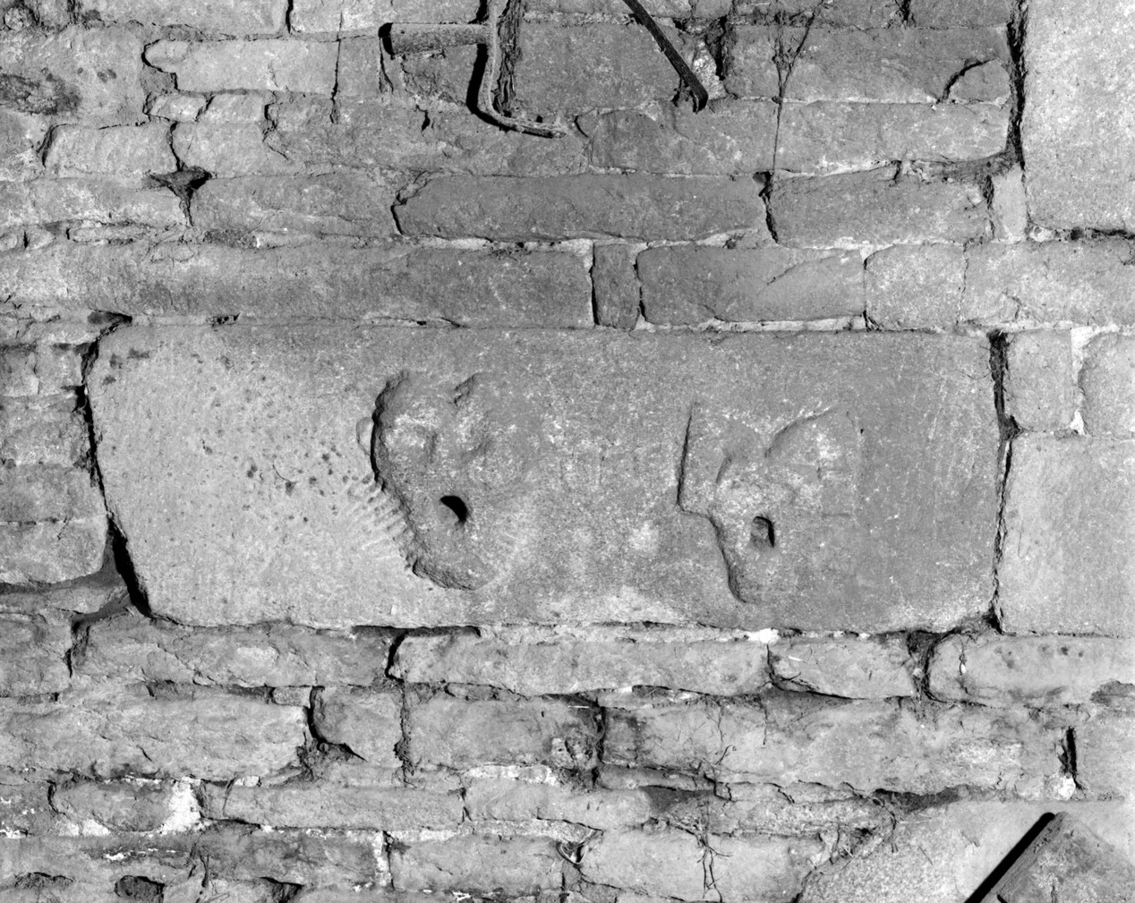 Alignement nord, pignon ouest de la salle. Détail de la pierre sculptée alimentant le lave-main. (1983)Immatriculation