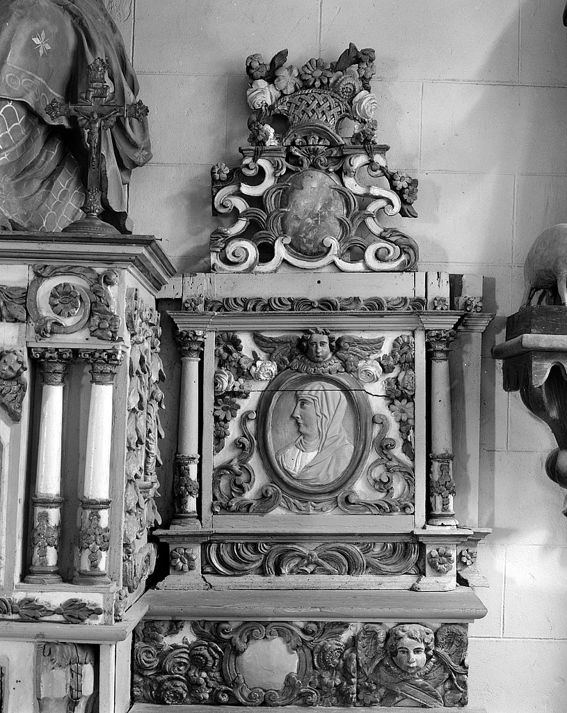 Autel, tabernacle, gradins d'autel (2) (anciennement autel-retable numéro 2), dit de la Vierge, église paroissiale Saint-Magloire (Mahalon),