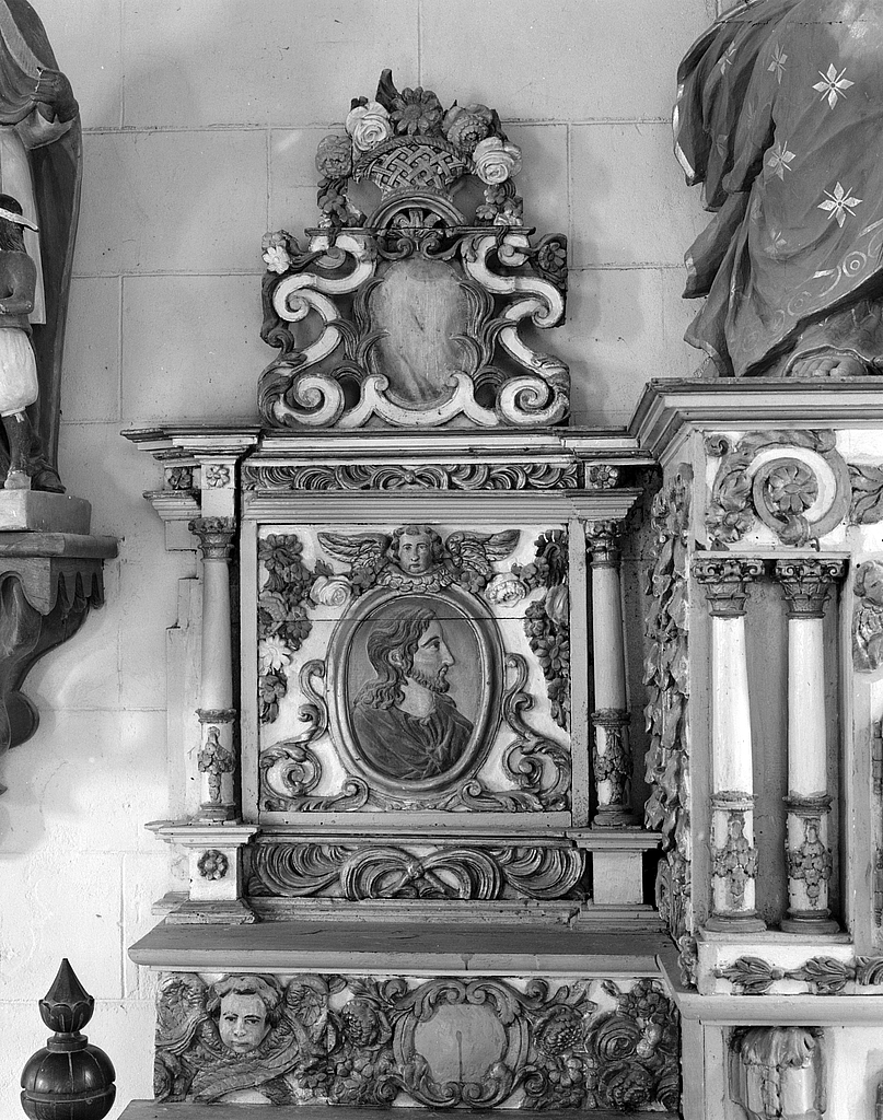 Autel, tabernacle, gradins d'autel (2) (anciennement autel-retable numéro 2), dit de la Vierge, église paroissiale Saint-Magloire (Mahalon),