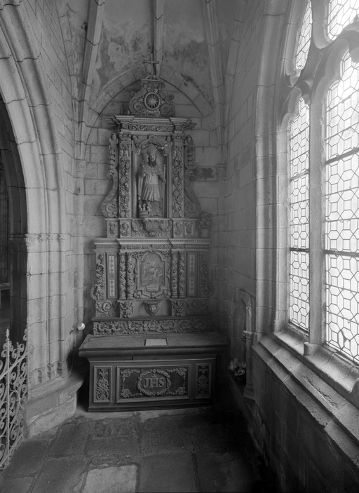 Autel, retable, gradin d'autel, tableau (autel secondaire, autel tombeau, retable architecturé à niche, tableau d'autel), de saint Nicolas, (anciennement retable numéro 4), église paroissiale Notre-Dame-de-Roscudon (Pont-Croix),