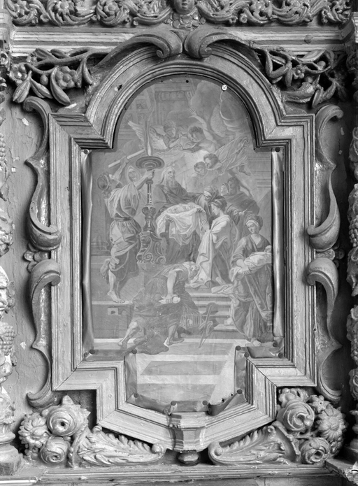 Autel, retable, gradin d'autel, tableau (autel secondaire, autel tombeau, retable architecturé à niche, tableau d'autel), de saint Nicolas, (anciennement retable numéro 4), église paroissiale Notre-Dame-de-Roscudon (Pont-Croix),
