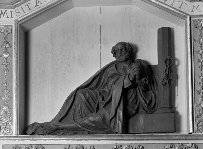 Autel, retable, ronde-bosse, statue, groupe sculpté (autel secondaire, autel tombeau, retable architecturé à niche), de saint pierre, (anciennement retable numéro 2), église paroissiale Notre-Dame-de-Roscudon (Pont-Croix),