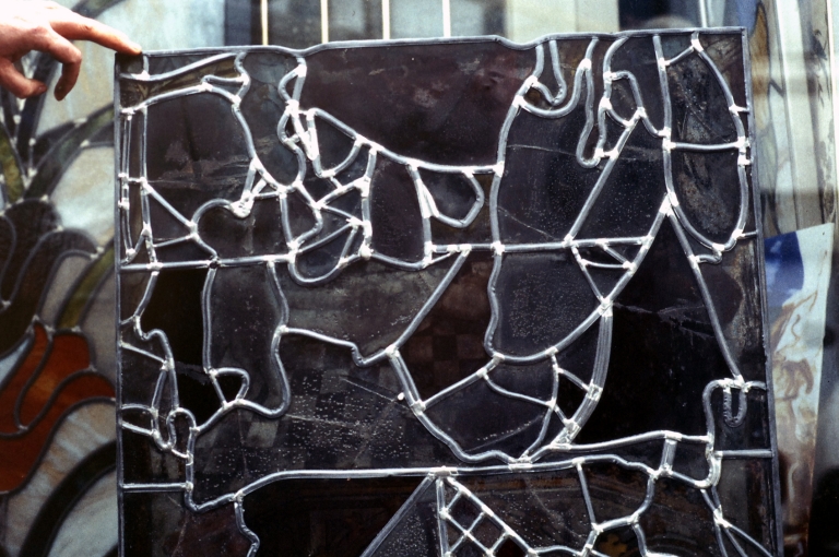 Verrière 1 après restauration, vue prise en atelier Briand à Rennes : panneau 2b, revers, partie supérieure.Immatriculation