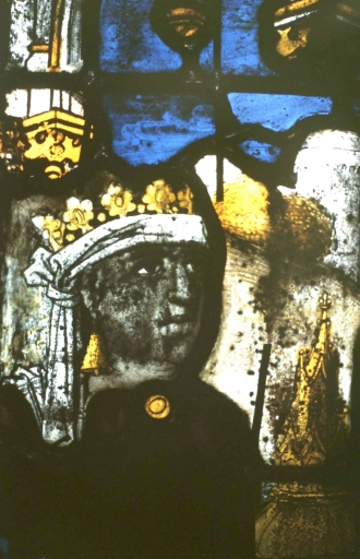 Verrière 1 après restauration, vue prise en atelier Briand à Rennes : panneau 3a, détail de Melchior.Immatriculation