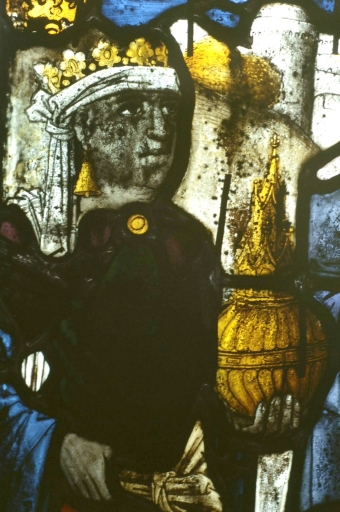 Verrière 1 après restauration, vue prise en atelier Briand à Rennes : panneau 3a, détail de Melchior.Immatriculation