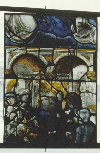 Verrière 1 après restauration, vue prise en atelier Briand à Rennes : panneau 3b, vue d'ensemble.Immatriculation