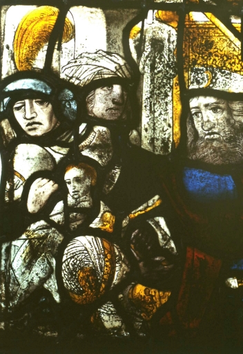 Verrière 1 après restauration, vue prise en atelier Briand à Rennes : panneau 3b, moitié inférieure gauche.Immatriculation