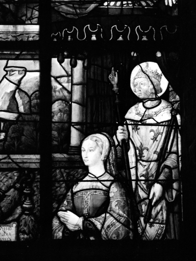 Verrière 4 : Tansfiguration, détail du registre inférieur, panneau droit.Immatriculation