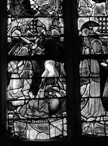 Verrière 1 : Vie de la Vierge, panneau b1, vue générale.Immatriculation