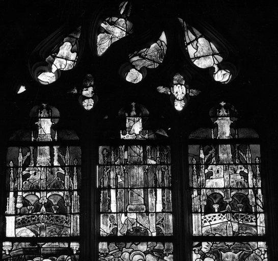 Verrière 1 : Vie de la Vierge, registre supérieur et réseau, vue générale.Immatriculation