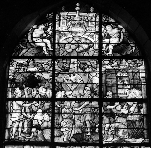 Verrière 5 : Vie de saint Jean-Baptiste, détail du registre et du fronton, vue générale.Immatriculation