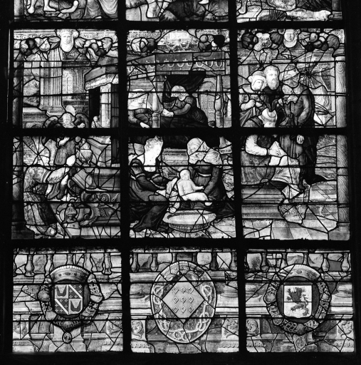 Verrière 5 : Vie de saint Jean-Baptiste, détail du registre inférieur et armoiries, vue générale.Immatriculation