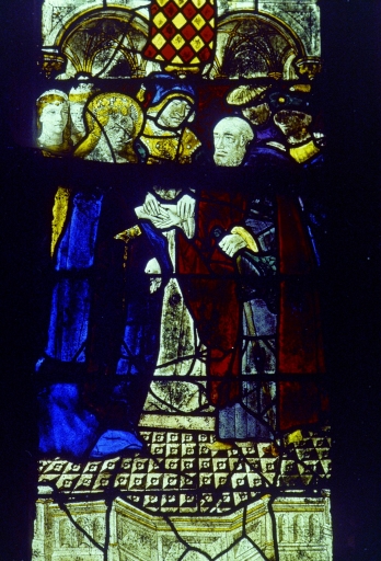 Vitrail de la vie de la Vierge, détail : le mariage, panneau inférieur gauche.Immatriculation