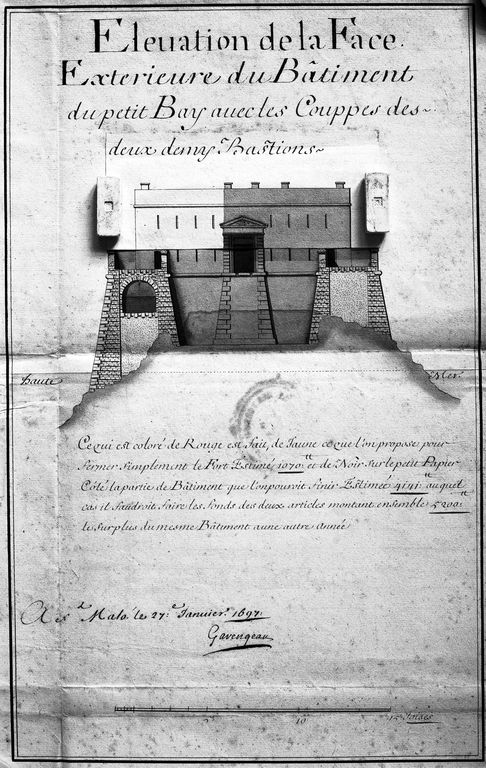 Elévation de la face extérieure du bâtiment du Petit Bé, fait à Saint-Malo par Garangeau le 27 janvier 1697Immatriculation