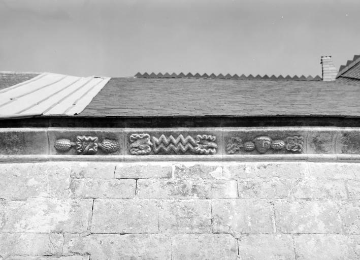 Elévation sud, partie est, corniche sculptée : partie gauche.Immatriculation