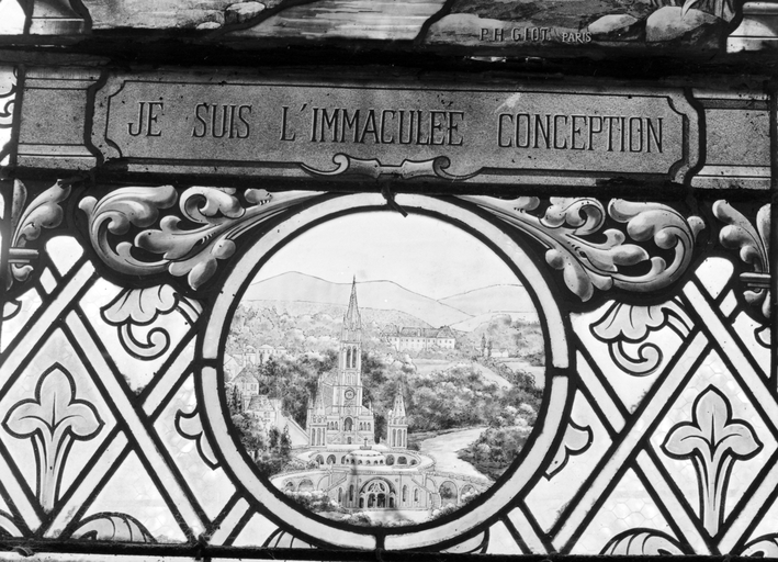 Ensemble de verrière n°5, détail : Lourdes.Immatriculation