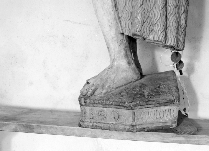 Statue de saint Jean-Baptiste, détail de l'inscription.Immatriculation
