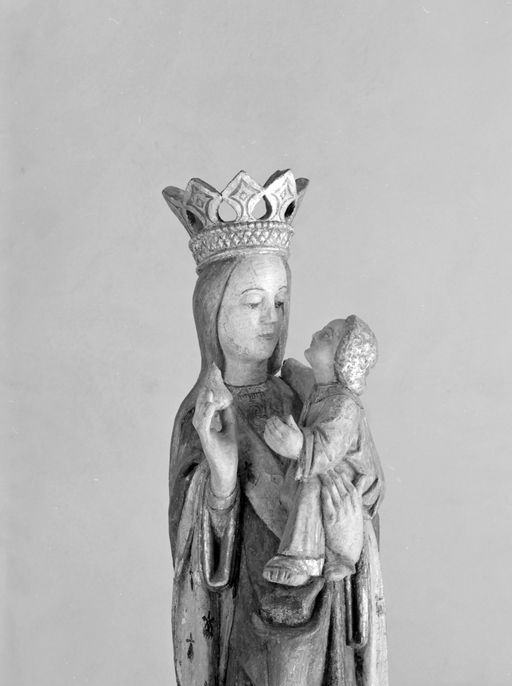 Statue de Vierge à l'Enfant, détail des têtes.Immatriculation