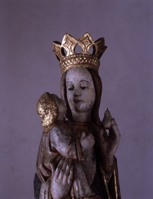 Statue de Vierge à l'enfant, détail des têtes.Immatriculation
