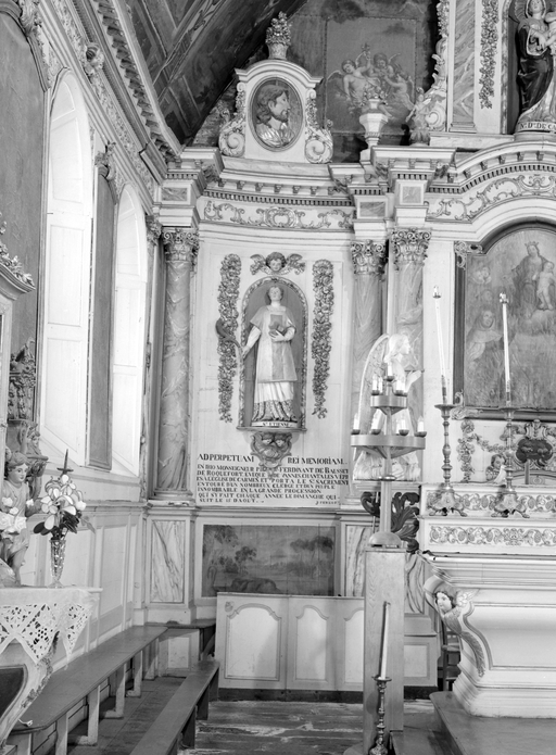Autel, retable, tabernacle, gradins d'autel (2), lambris de hauteur (maître-autel, autel tombeau, retable architecturé) : de la Vierge, chapelle Notre-Dame-de-Carmes (Neulliac),