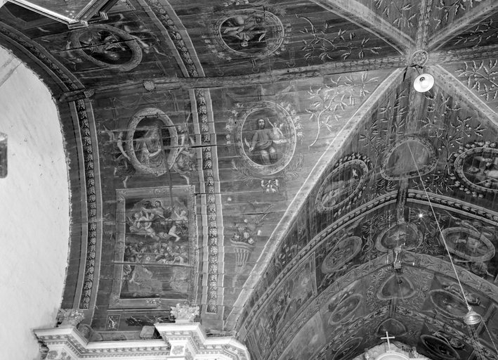 Ensemble de peintures de plafond A, bras nord, face est et choeur : vue générale.Immatriculation