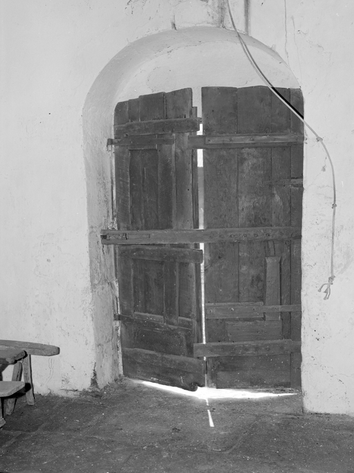 Vue générale porte ouest entre-baillée, système de poutres croisées.Immatriculation