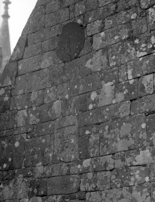 Bras sud : armoiries et cadran solaire.Immatriculation