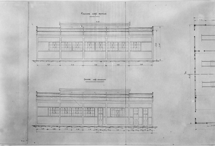 Station de Tréguier : plan des façades côté remise et côté magasin.Immatriculation