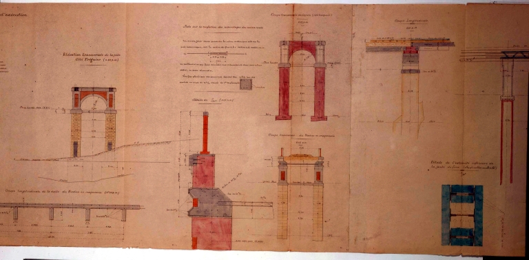 Ligne de Tréguier à Perros-Guirec : pont métallique sur le Guindy et viaduc en maçonnerie côté Tréguier : élévation, coupe longitudinale, coupe transversale.Immatriculation