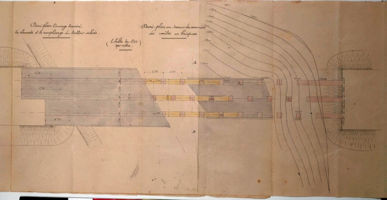 Ligne Saint-Brieuc - Plouha : passage supérieur de Rohannet : demi-plan de l'ouvrage terminé, demi-plan au-dessus des sommées des voûtes.Immatriculation