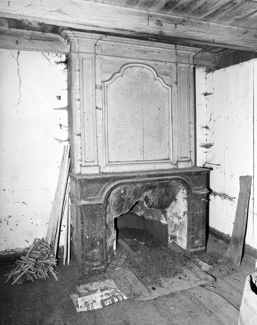 Etage, pièce centrale ouest, cheminée en boiserie, refends ouest. (1984)Immatriculation