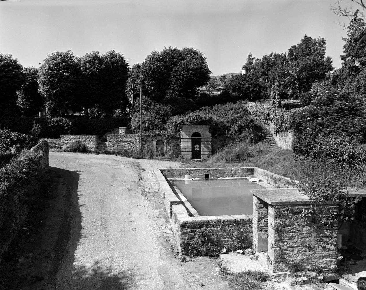 Vue générale prise du sud : lavoir et fontaine. (1984)Immatriculation