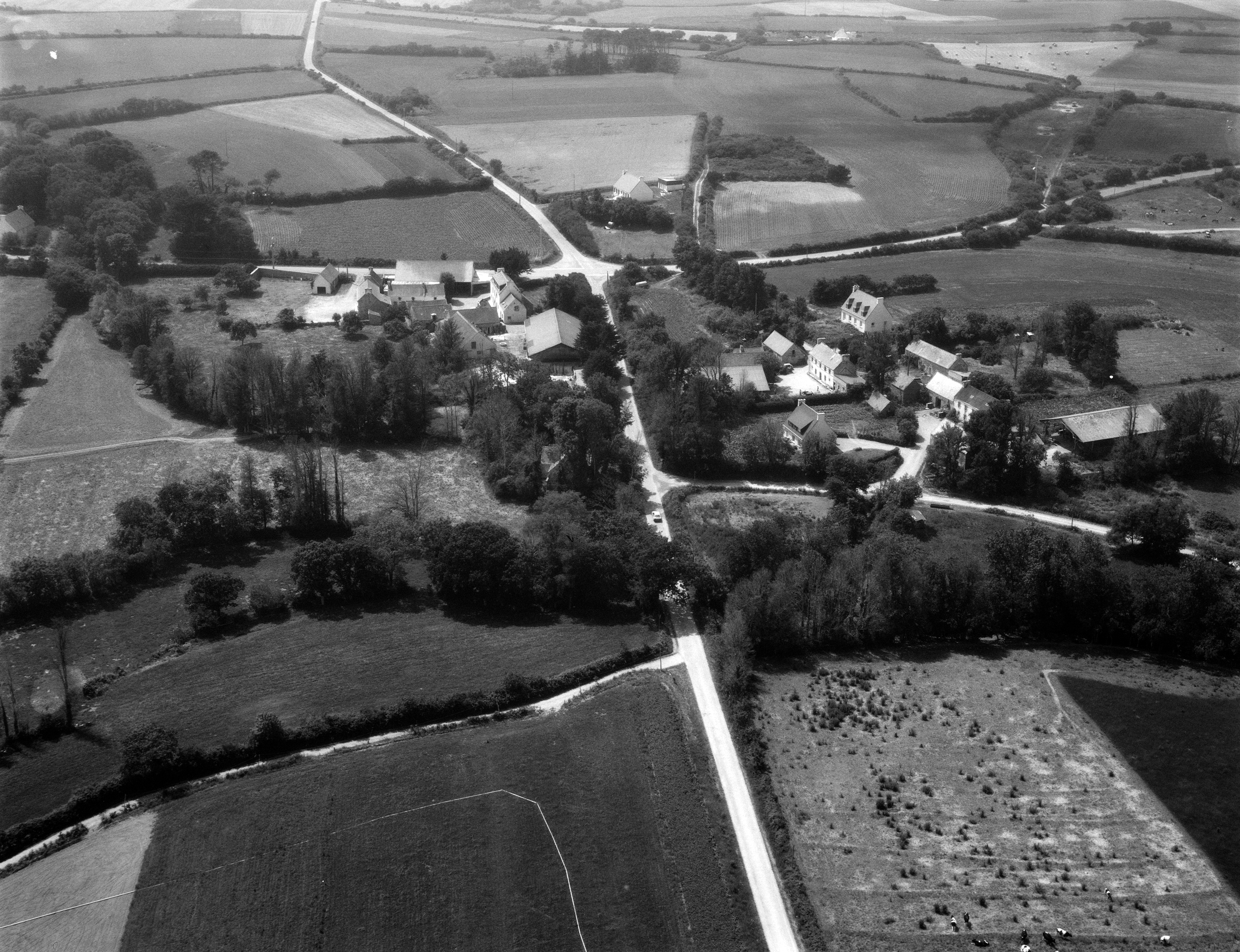 Village de Lescogan, vue aérienne prise de l'est. La chapelle est au premier plan, cachée par les arbres. (1984)Immatriculation