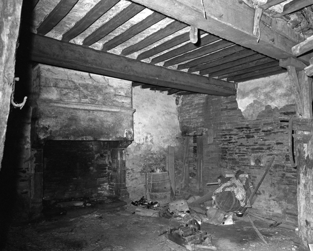 Vue intérieure de la salle du rez-de-chaussée, cheminée et accès à l'escalier (avant restauration)Immatriculation