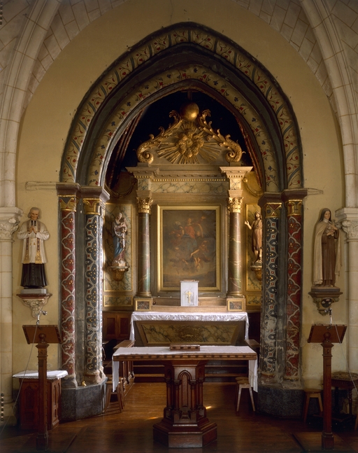 Autel, retable, statues (2) (maître-autel, retable architecturé) : Vierge à l'Enfant, Saint Jean Baptiste, église paroissiale Notre-Dame (Landavran),