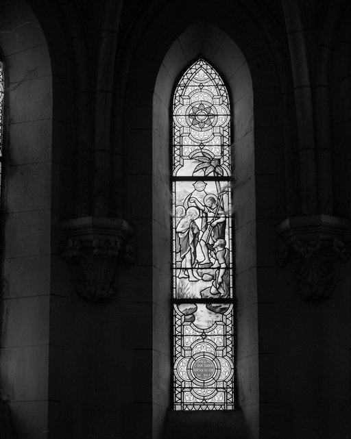 Verrières (8) (verrière historiée, verrière à personnages, rose, verrière décorative) (baies 42, 16, 19, 20, 28, 30, 32), église paroissiale Notre-Dame (Pocé-les-Bois),